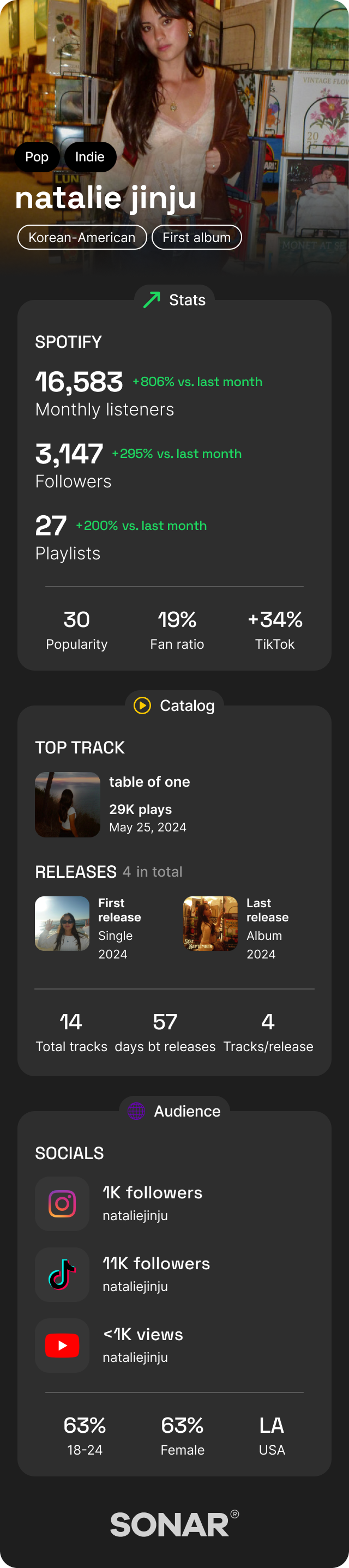 This young Korean American singer and songwriter catches you with a musical identity that just hit different. Mixing pop with jazz and even R&B notes, her sounds subtly leap across genres. She’s 18, hadn’t released music before 2024 and just published her first album called “Last September” - you know where to start.