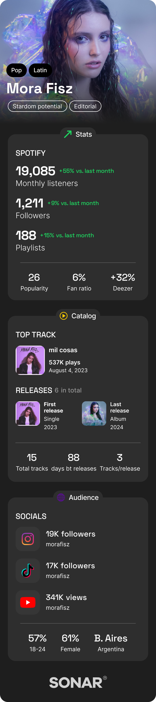 Keep an eye out for this young talent from Argentina, whose popularity is rising incredibly fast. He first single, “mil cosas”, has reached over 500K streams in a little over a year. With a compelling voice and a rising social following, Mora has a strong potential to emerge as one of Latin America’s new pop star soon.