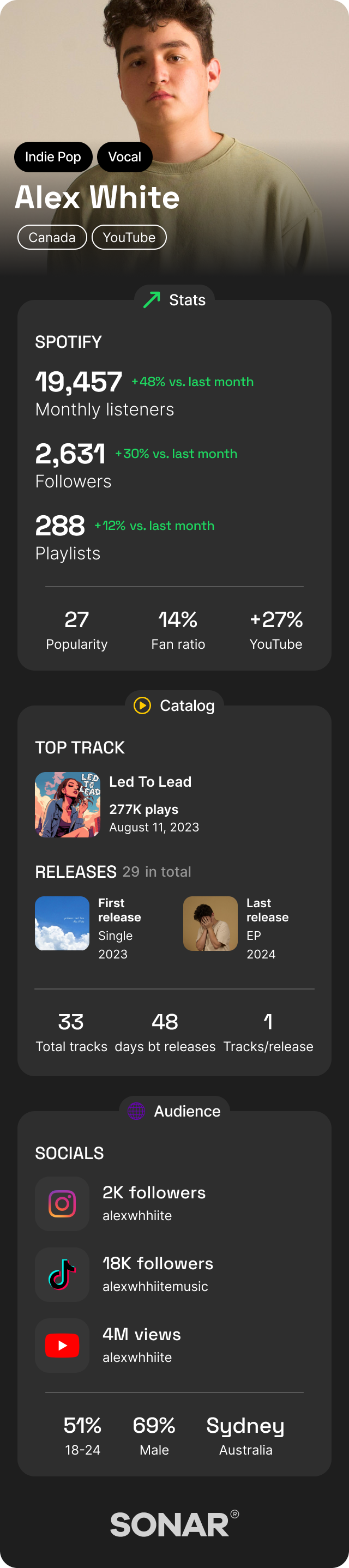 Alex is an 18-year old musician from Toronto with an incredible gift that stands him out: his voice. He defines his craft as “indie chill-pop with a hint of lofi” and has been very active in 2024 with his 6th release already. His YouTube channel is a strong asset with close to 4M views to date.