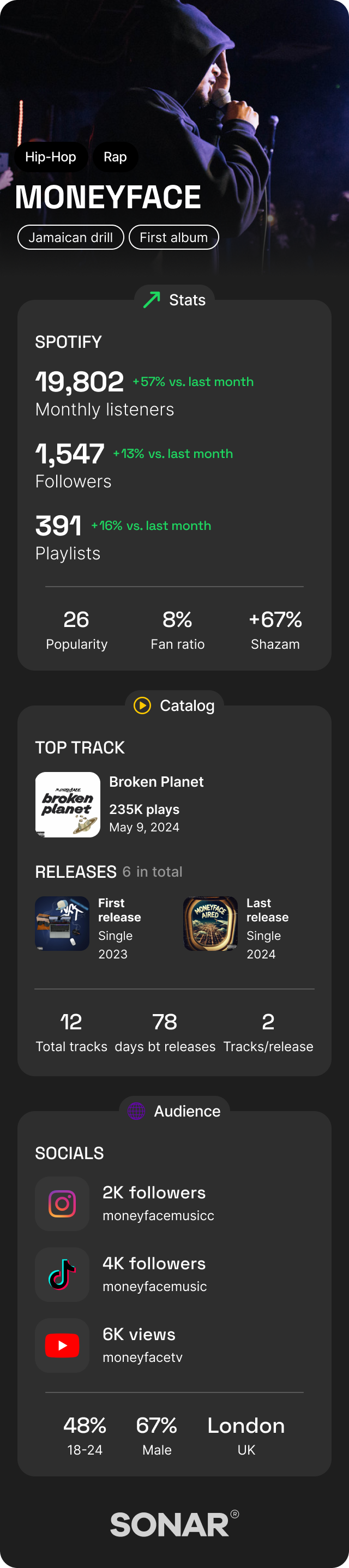 Meet this hip-hop artist from the UK with Jamaican roots and a sound that mixes drill rap, jazz vibes, and sharp modern beats. His hit single “Broken Planet” is making waves on streaming platforms as he’s still building his social following.