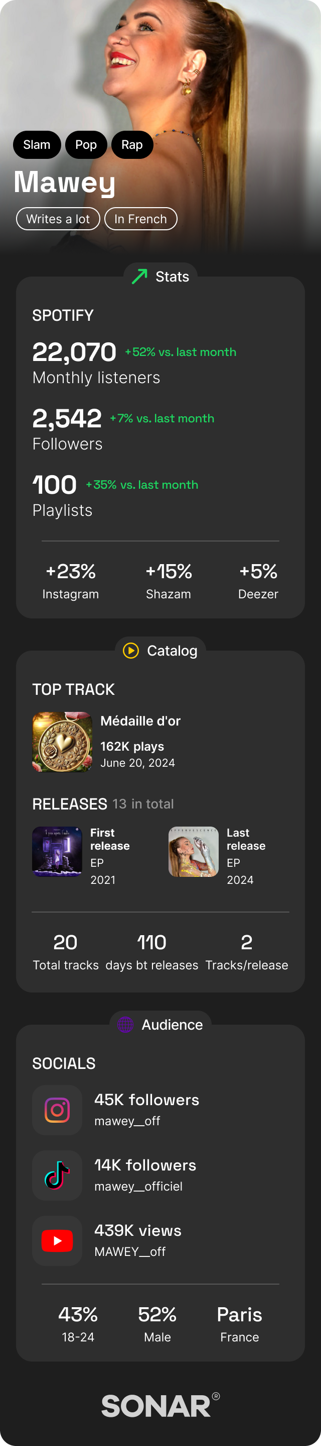 Mawey has everything of a (too rare) future success story for a woman in the French urban scene. Her music intertwines rap, slam and vocals with mind blowing facility. She’s also a compulsive writer, having composed over 480 musical pieces in two years.