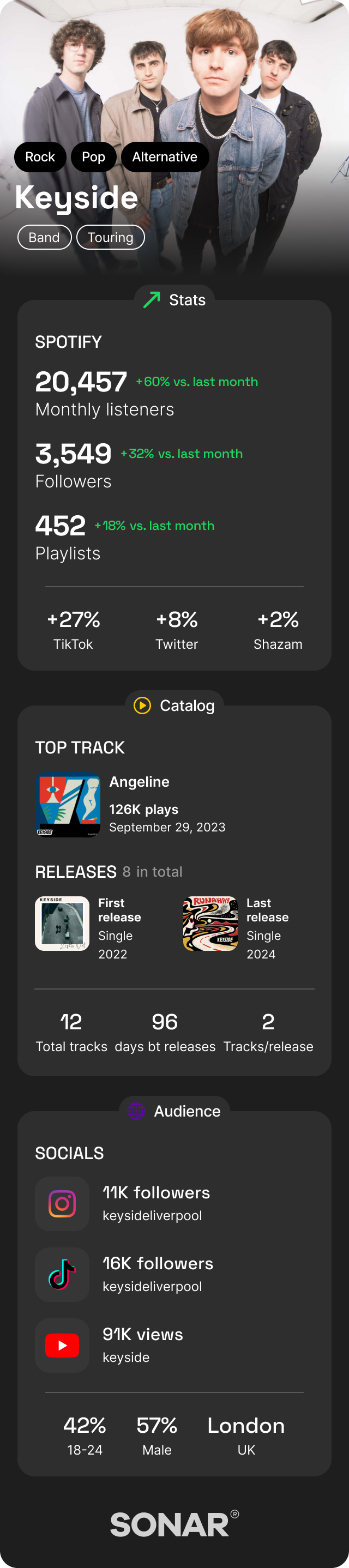 The Liverpool band has risen in the British pop/rock scene with pristine sounds and powerful lyrics treating of industrial, working-class topics. They have shows lined up across England through the end of 2024 and announced the release of an EP for 2025.
