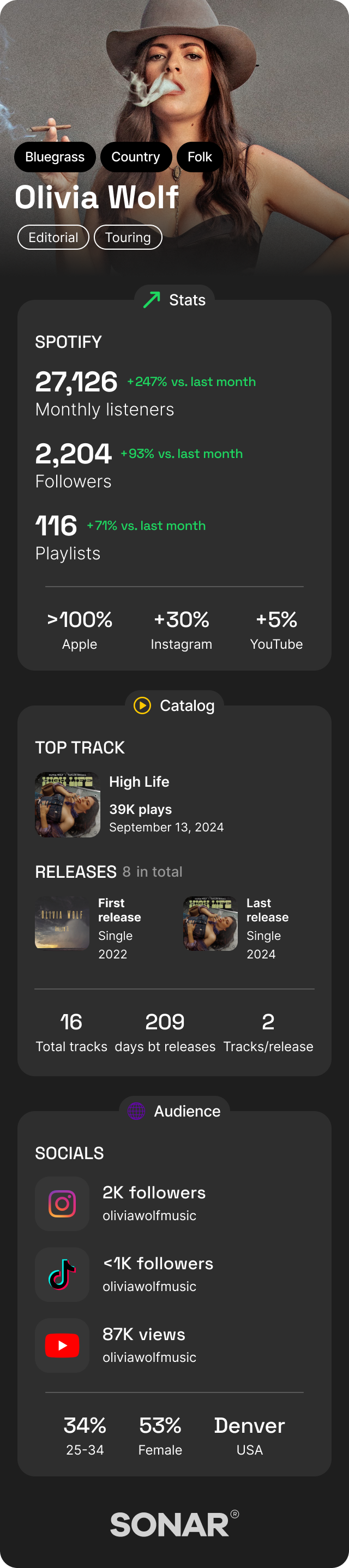 Olivia’s music draws from soulful sounds to convey emotion and spirituality. She’s received a lot of editorial coverage, with notable additions to Indie Bluegrass or the official Starbucks coffeehouse playlist. She’s booked for 3 live gigs in Texas in November.