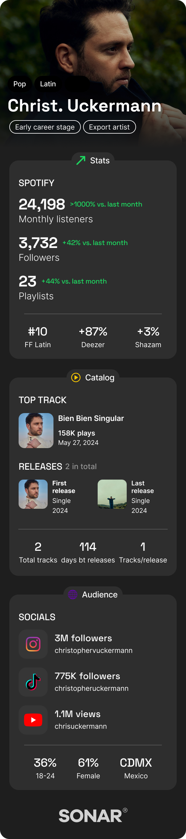 This pop singer from Mexico reached success straight away with his first release back in May. His second single came out in September and made it to Fresh Finds Latin within 2 weeks of release. His social media reach is impressive, with over 3M followers on Instagram and close to 800K on TikTok.
